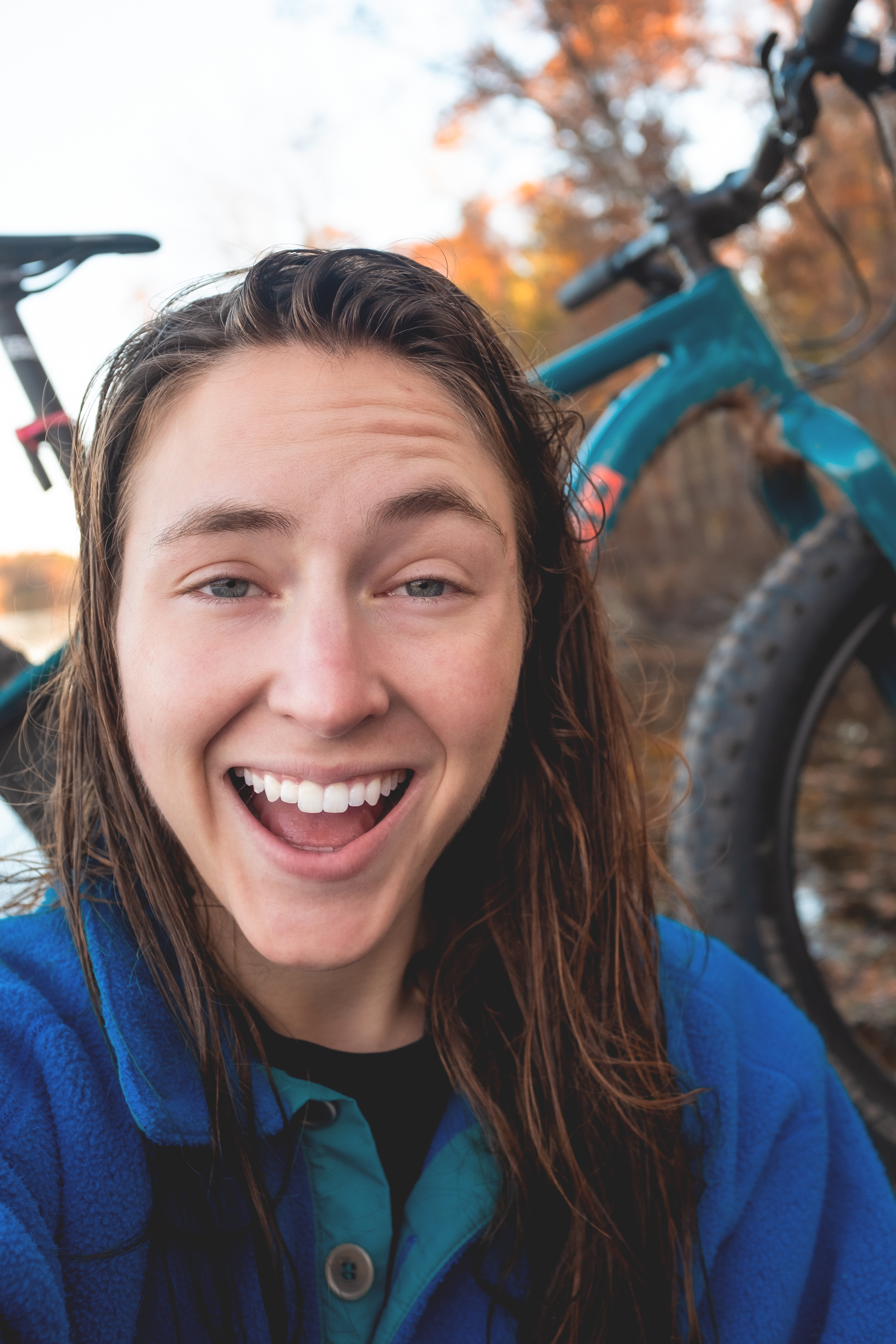 I feel insulated and in my own orbit, the dark bestowing me with that; what I would emerge is anyone’s guess. I hit a section of road and listened to the roar of a pickup roll by. I thought again of all those hit and killed – forever in my mind. I hear cheering and take a left. Lyle’s voice. People drive out here to cheer us on. Wow, what love. What joy. Rolling along was absolute bliss. My only focus, this a moving meditation through the woods. My legs rotating, the meditation continued. All too soon trees, arms outstretched to the sky, stand silhouetted thanks to the source of the coming day. An unmarked turn and a rider behind me had me look back as I overshot. Dressed in capris and flats, I was stoked to meet this human: Landon, the one with the regular 4am bedtime. Cresting a super steep and muddy hill together with effort, on bikes that largely roll like perfectly softened butter does across a sourdough-scape, but are a little clumsy with sharp maneuvers, we are triumphant and giddy. The best descent of the day follows: straight down, muddy and rooty, with a hiccup of a hill near the bottom…and… the moon eyes of a pumpkin glaring with candle lit retinas. I had to smile and wait for Landon, staring into, and then photographing, those same moons.